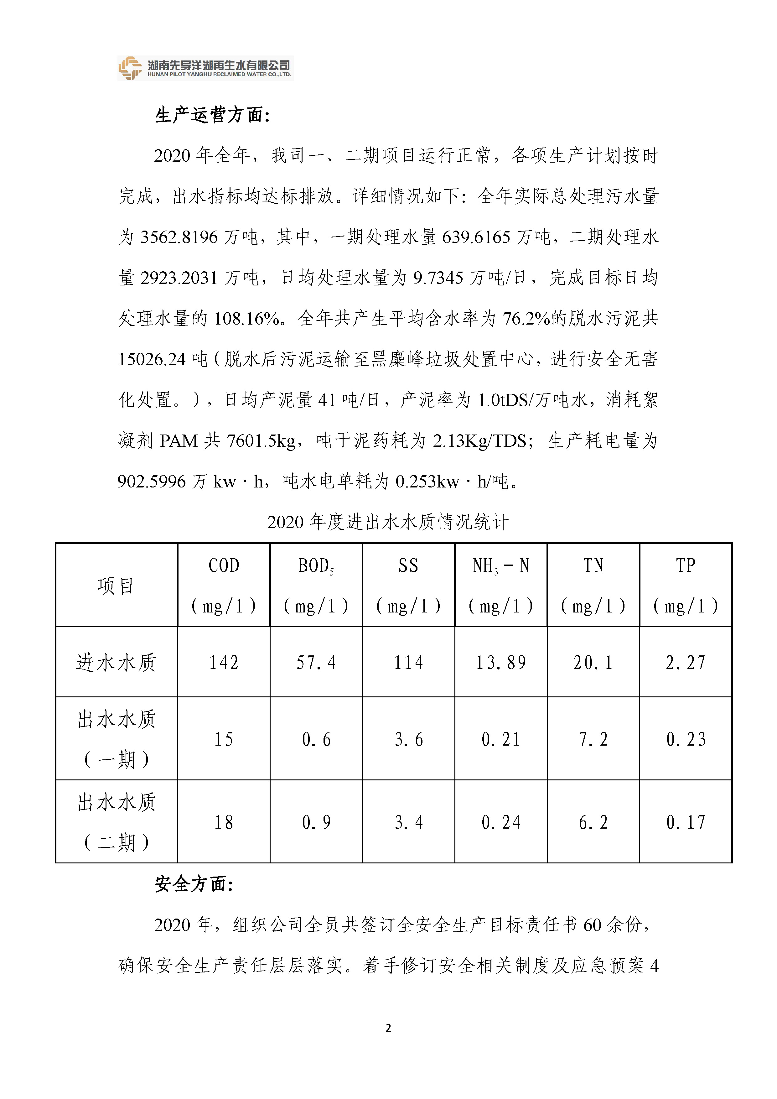 湖南先導(dǎo)洋湖再生水有限公司 2020年度經(jīng)營公報(bào)