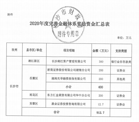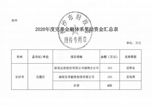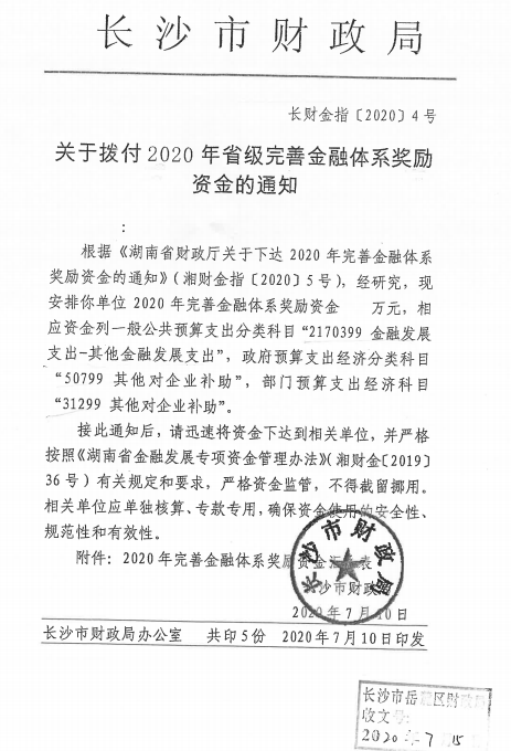 上月底,湖南省地方金融監(jiān)督管理局、湖南省財政廳官網公示2020年度省級金融發(fā)展專項資金獎勵名單,擬對擔保公司給予200萬元獎勵。7月24日,長沙市財政局下發(fā)《關于撥付2020年省級完善金融體系獎勵政策資金的通知》(長財金指〔2020〕4號),擔保公司喜獲200萬元專項資金獎勵。